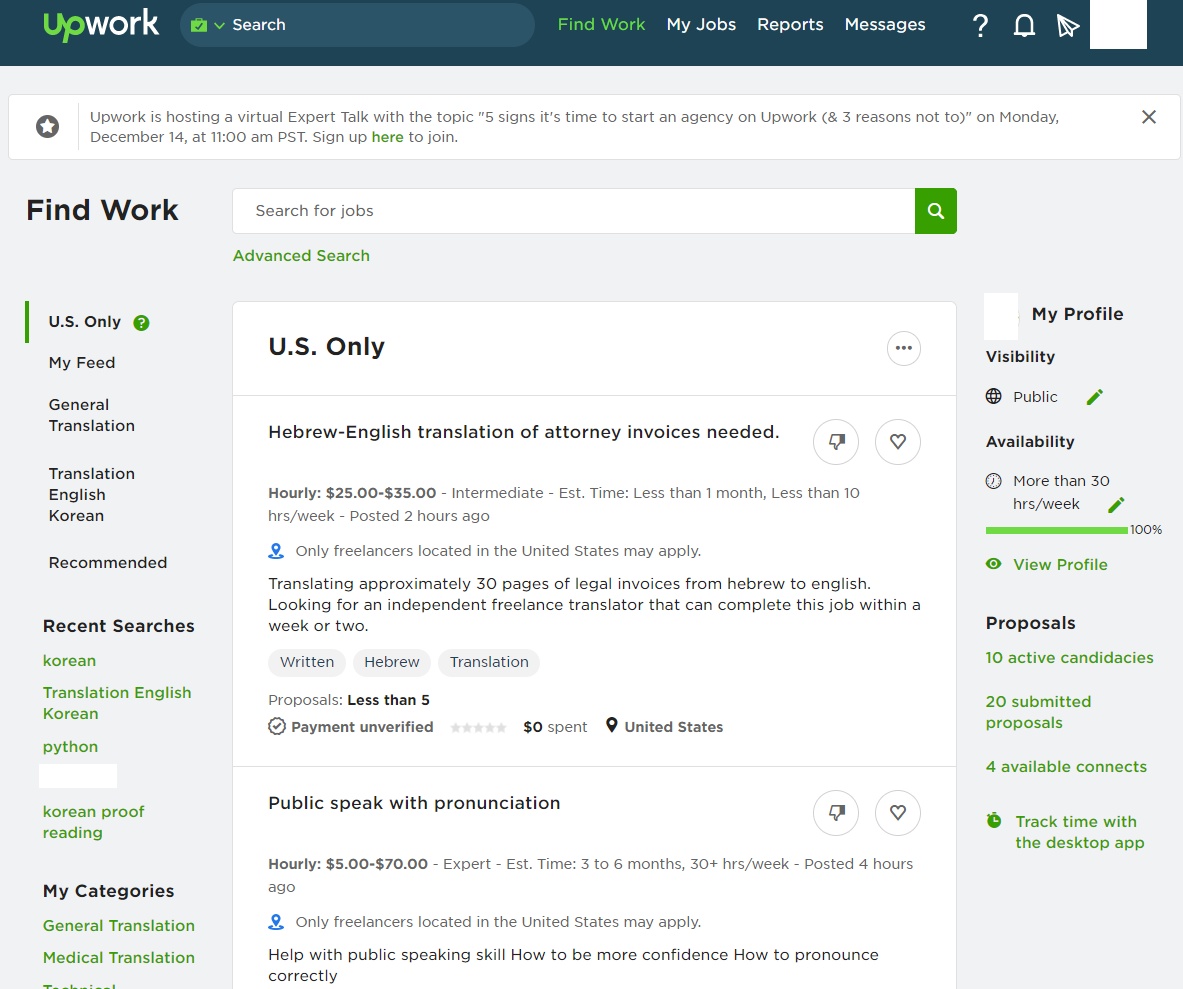 훨씬 합리적으로 일을 찾을 수 있고, 그 일에 대한 페이도 적정선으로 받을 수 있기 때문이야. 배경을 알고, 타겟을 정하면, 훨씬 비싼가격에 일을 찾을 수 있는거지. 코딩분야와 번역분야에서 만큼은 업워크 사이트 내에서 검색어 선정이 중요해.